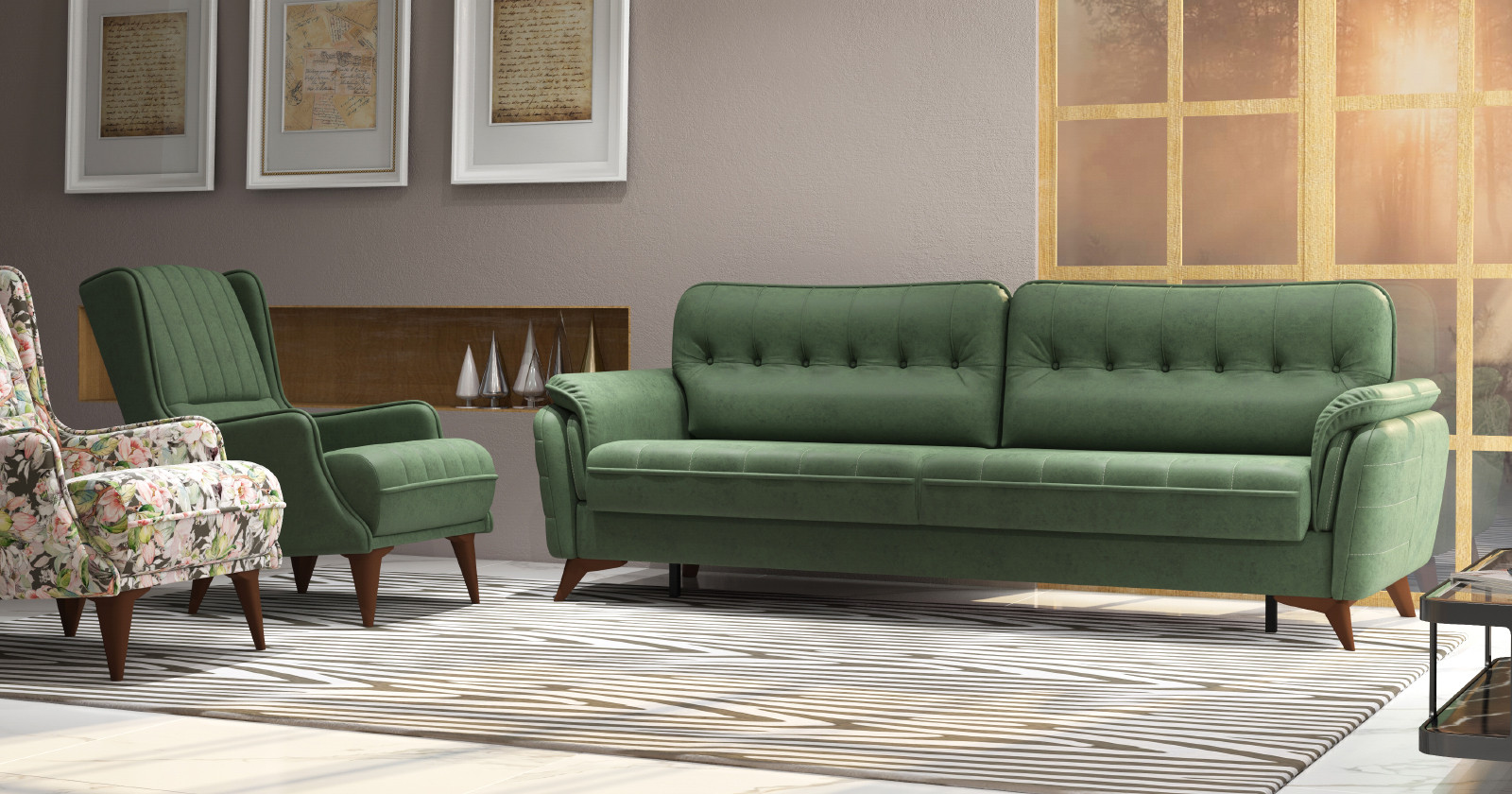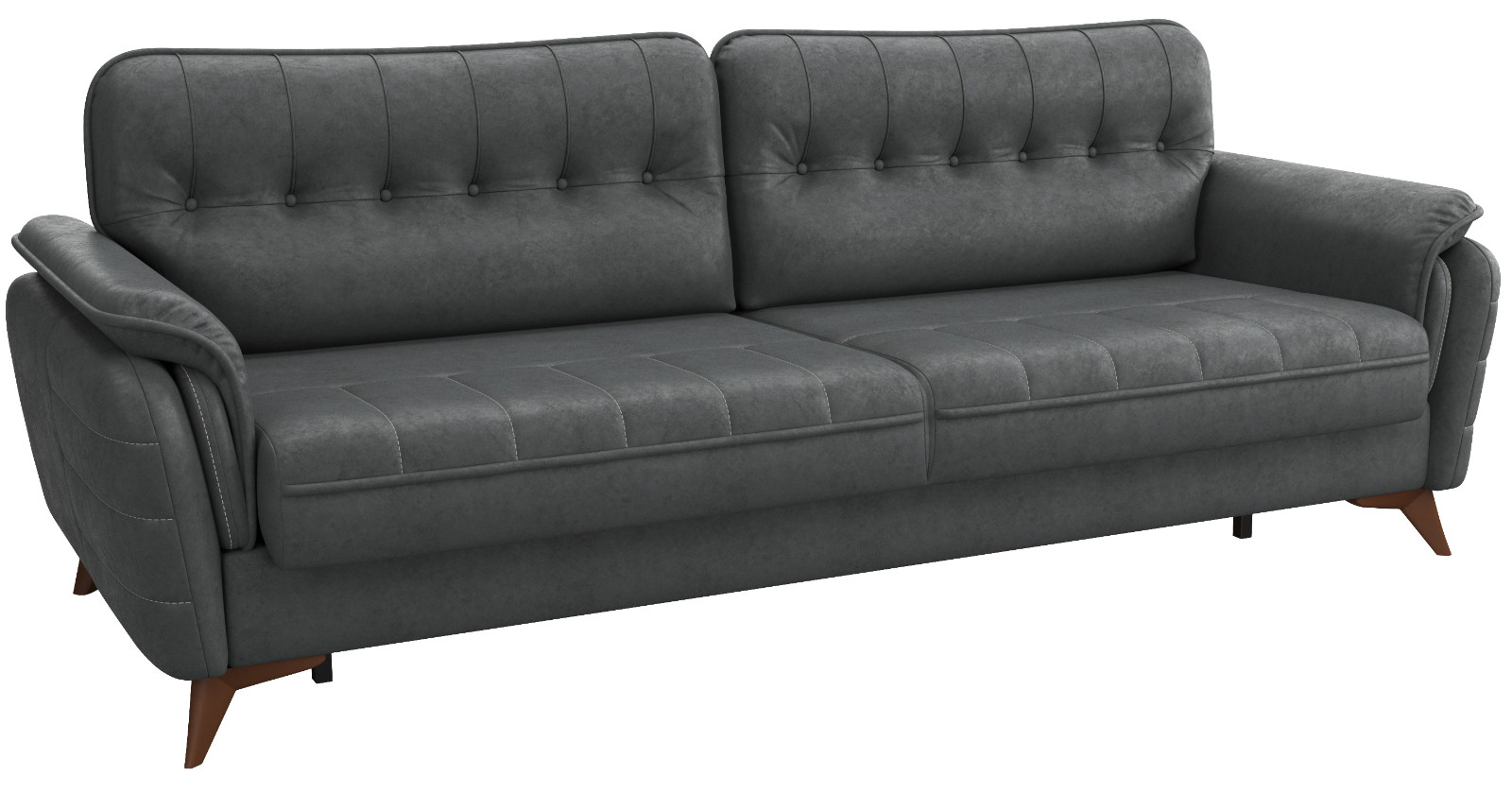 - Декоративные канты на подушках дивана, подлокотниках и сиденье. Стежка на передней части сиденья и внешней части подлокотника. Защипы на верхней части подушки. Втяжки с пуговицами на приспинных подушках.