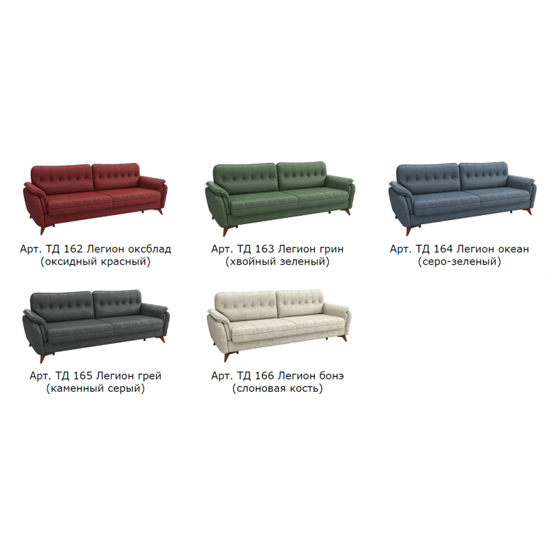 Основная ткань: Легион (иск. замша). Мягкая мебельная замша с модной фактурой и легким ворсовым эффектом. Природные цвета коллекции подчеркивают ее сходство с натуральным аналогом. Не подвержена образованию заминов в условиях повседневной и интенсивной эксплуатации. Хорошо держит форму, не вытягивается, долго сохраняет первоначальный эстетичный вид. Экологичность и высокие эксплуатационные характеристики микрозамши достигаются благодаря использованию инновационных технологий при производстве. Коллекция имеет международный сертификат качества. Плотность ткани: 310 г/кв.м. Количество циклов истирания: более 25 000.