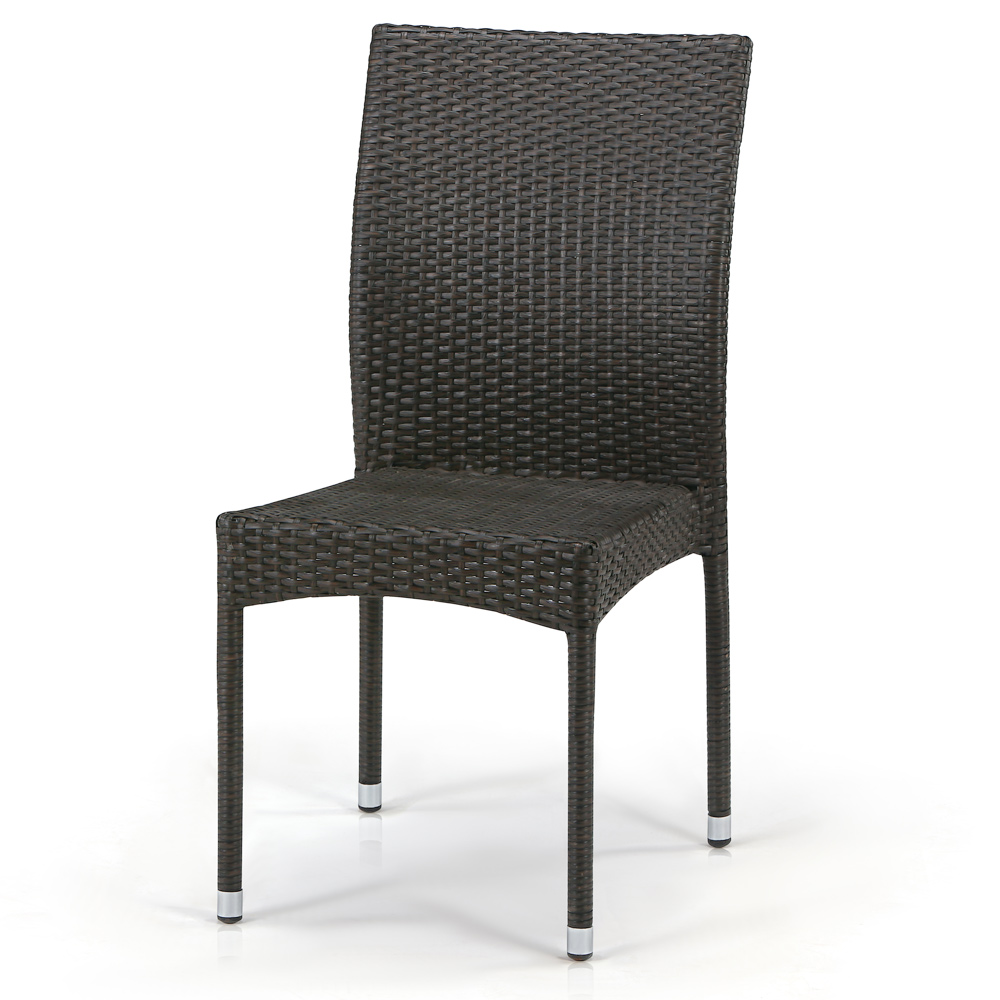 Стул из искусственного ротанга коричневого цвета выполнен в минималистичном дизайне без подлокотников. Идеально подойдет для заведения или загородного дома.